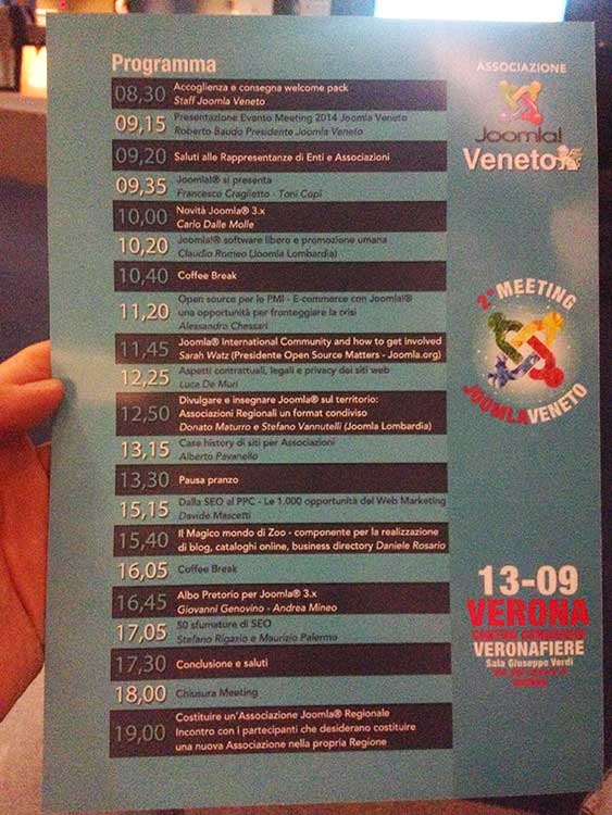 | Settembre 2014 | 2° meeting Joomla Veneto organizzato dall’organizzazione Joomla Veneto come relatore parlando di SEO |